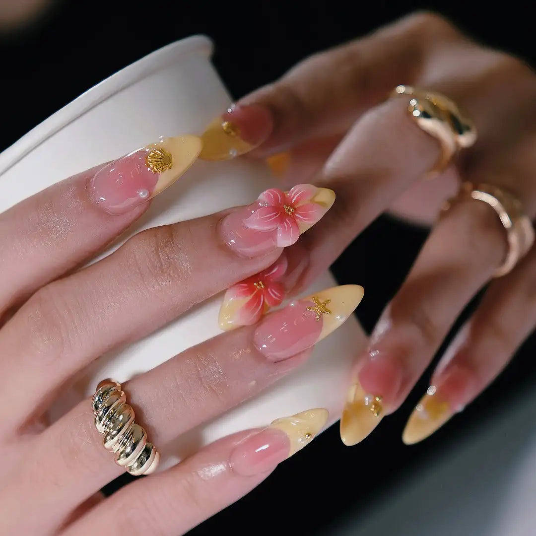 Golden Sunrise | Handmade Pink Yellow 3D Floral Press-On Nails