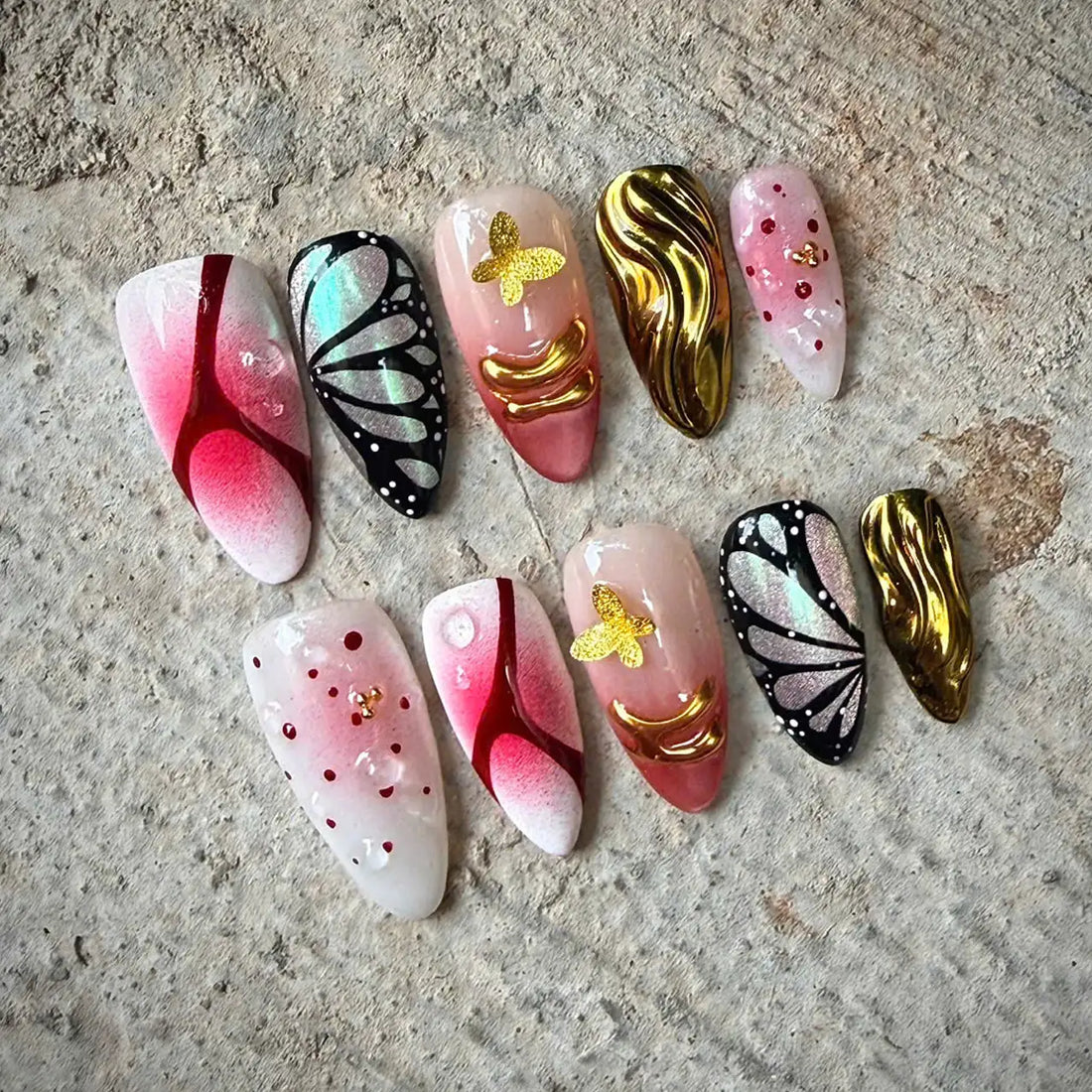 Chrome Butterfly | Handmade Red Gold Mix Almond Press-On Nails