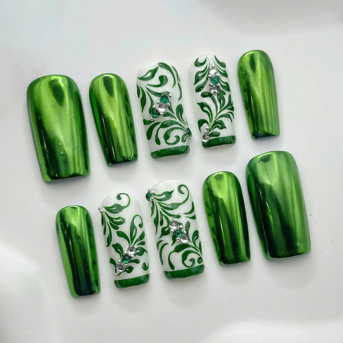 Emerald Chrome | Handmade Floral Swirl Rhinestone Press-On Nails