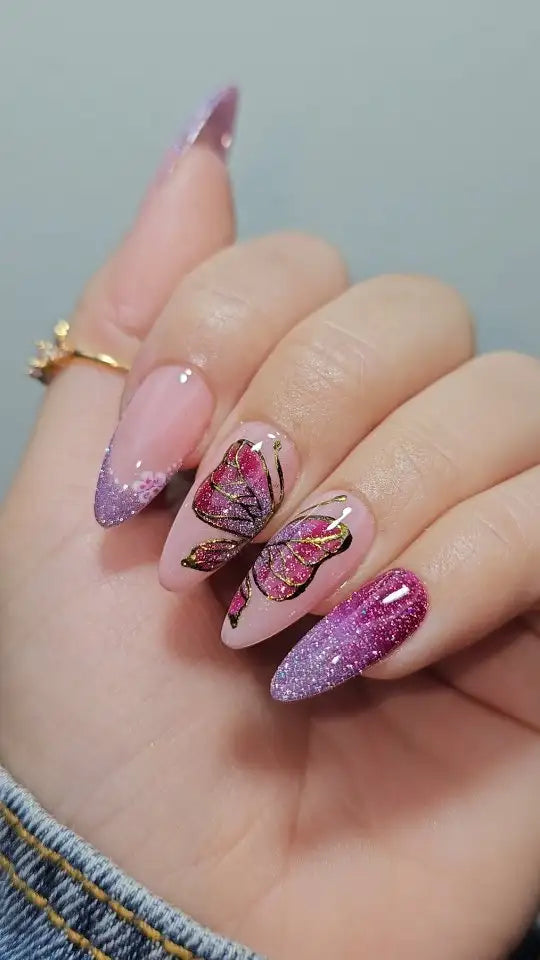 Glitter Butterfly | Handmade Pink Purple Floral Press-On Nails