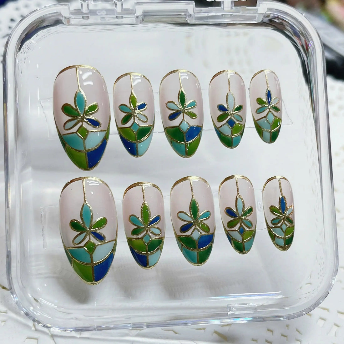 Embrace artistic elegance with these green stained glass fake fingernails, beautifully featuring unique floral designs...
