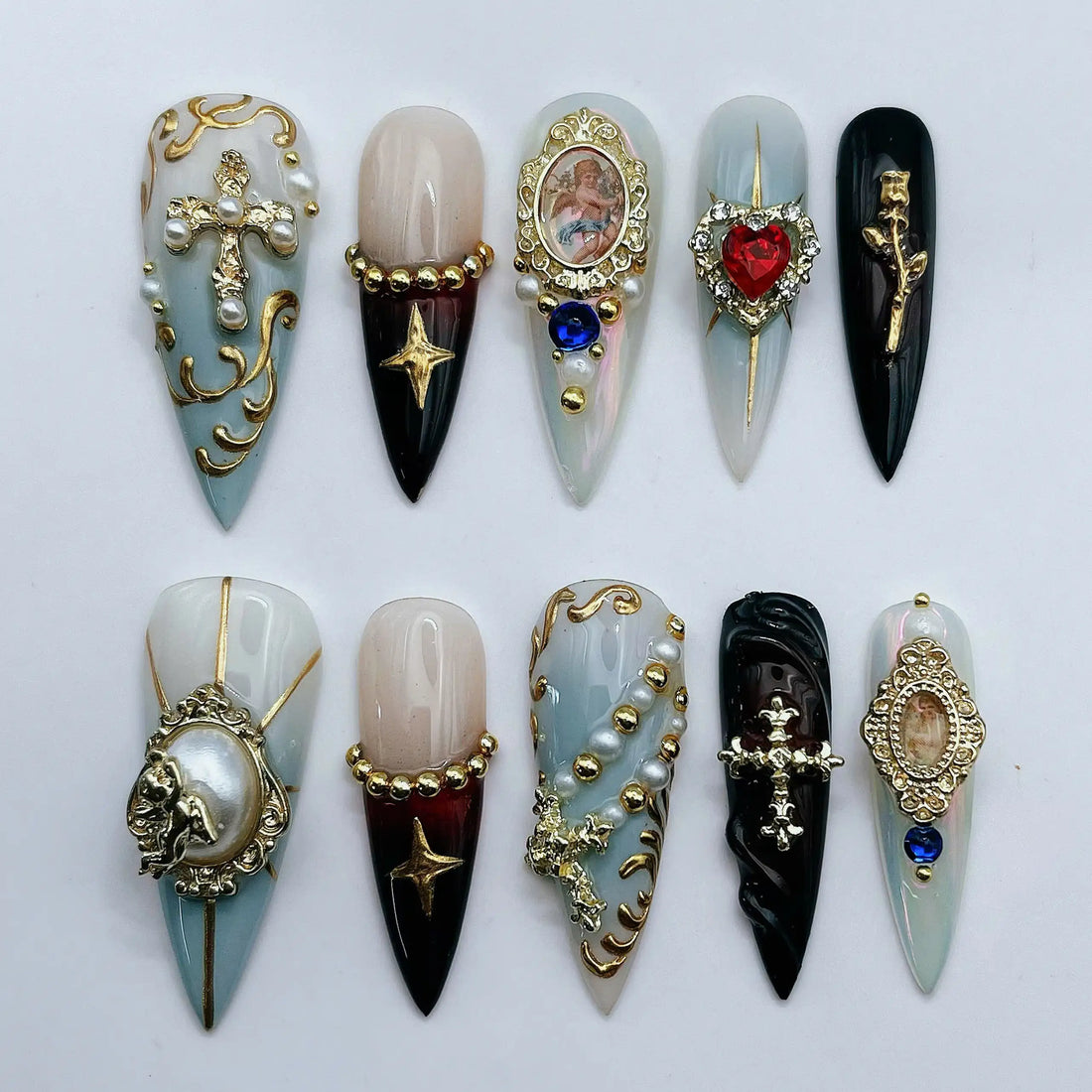 Make a divine statement with these luxury gothic fake fingernails, elegantly featuring stunning holy angels...