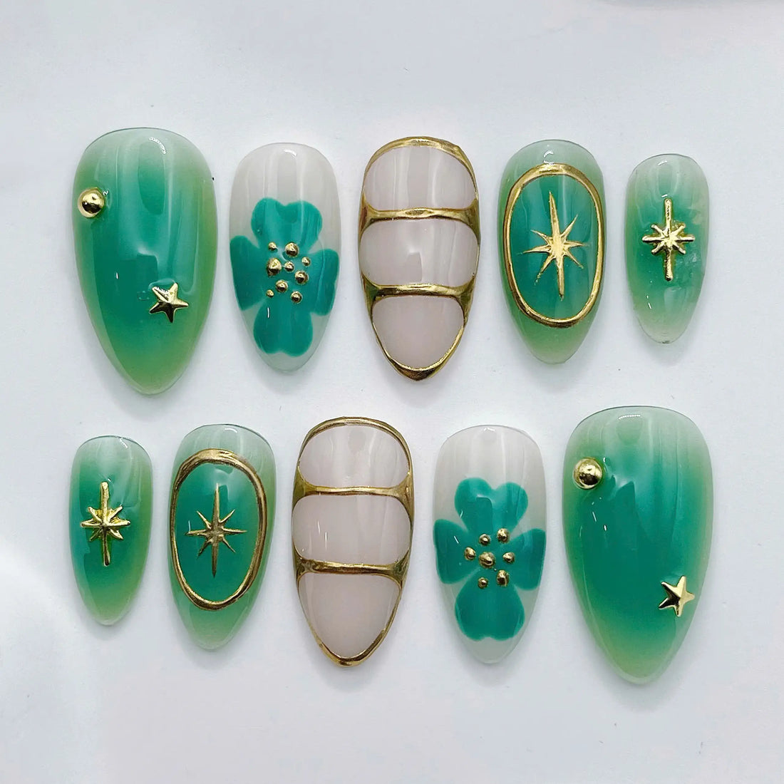 Lucky Clover | Handmade Festive Green Gold Star Press-On Nails
