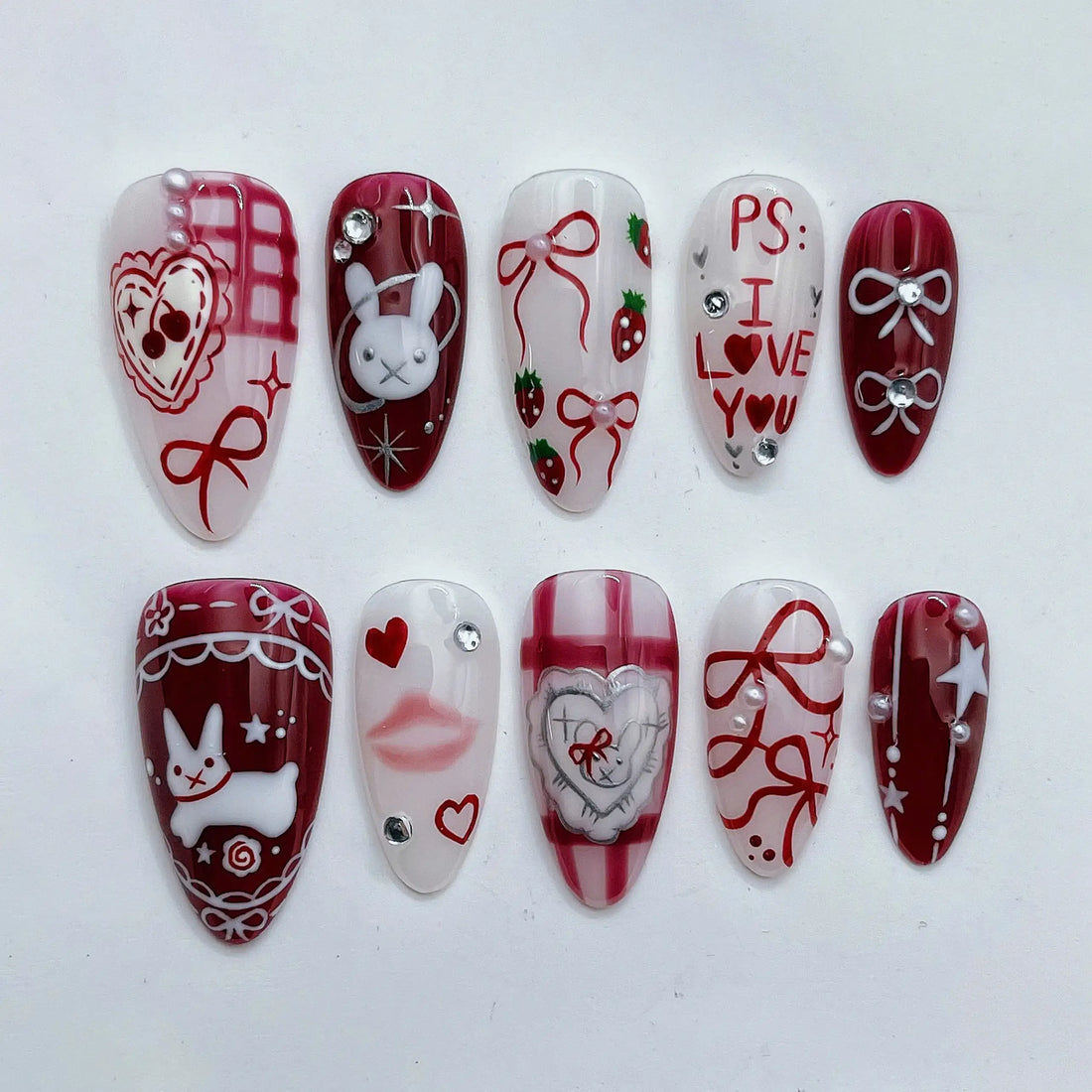 Romantic Bunny | Handmade Red Heart Valentine Press-On Nails