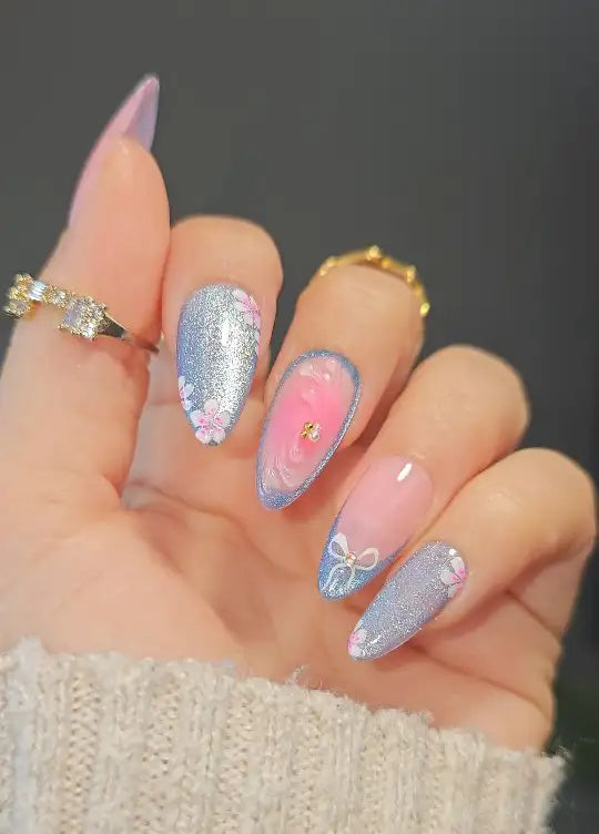 Sakura Blossom | Handmade Pink Blue Cat Eye Bow Press-On Nails