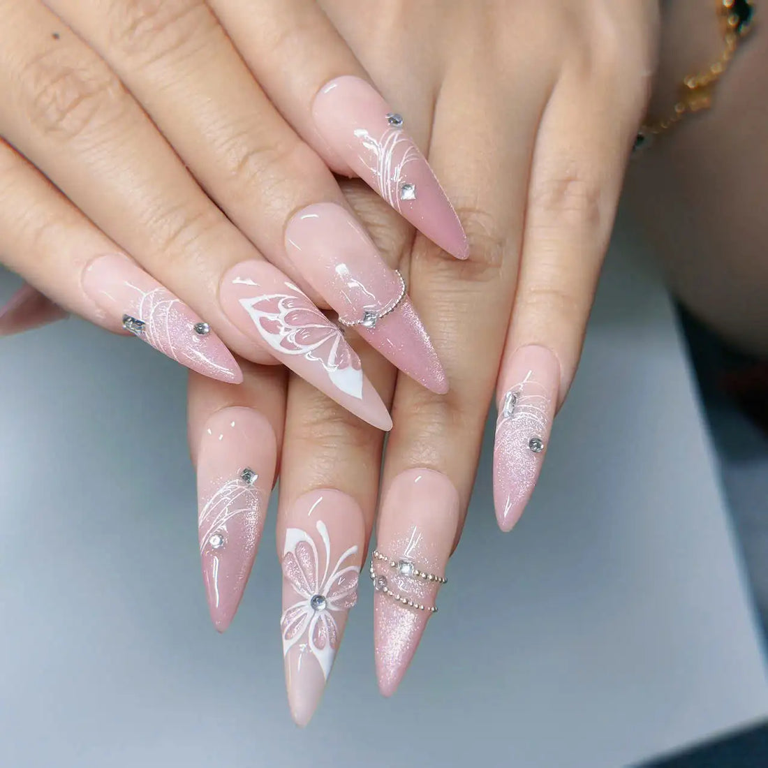 Silver Butterfly | Handmade Nude Pink Cat Eye Press-On Nails