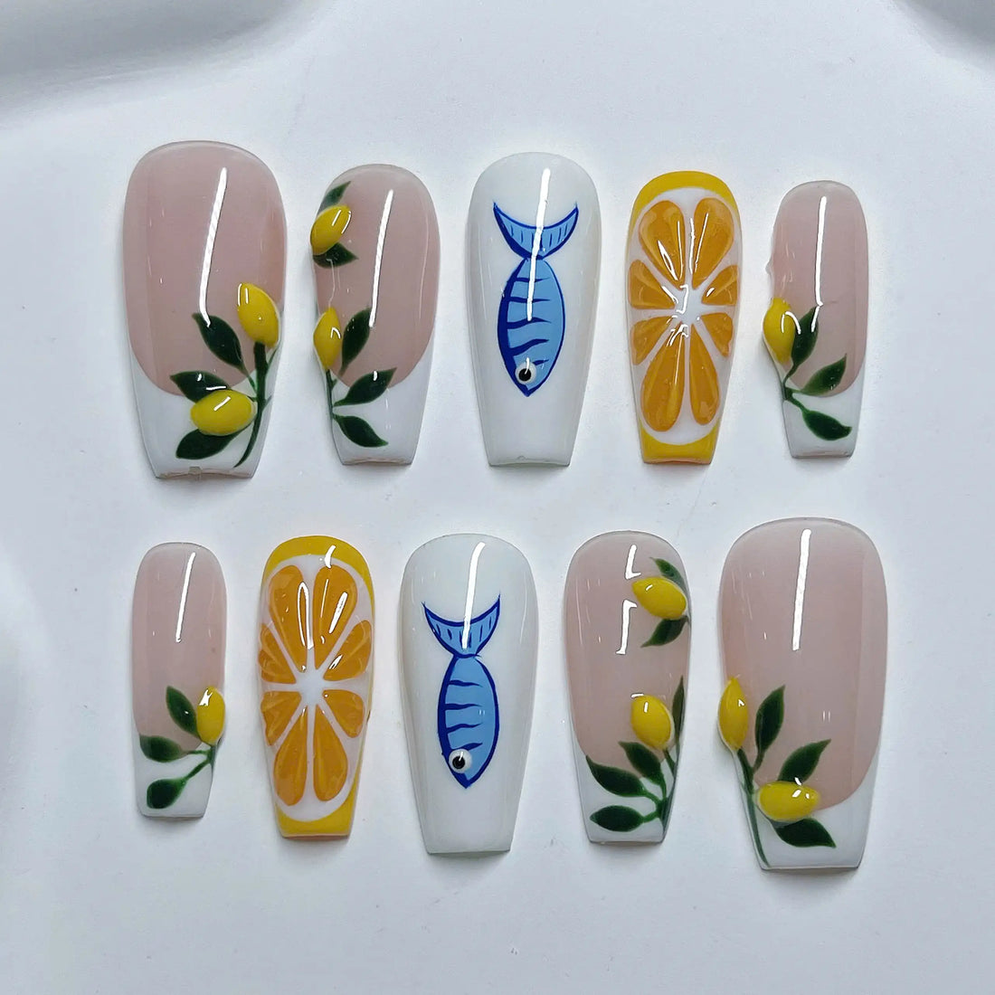 Citrus Swim | Handmade Lemon Orange & Fish Summer Press-On Nails
