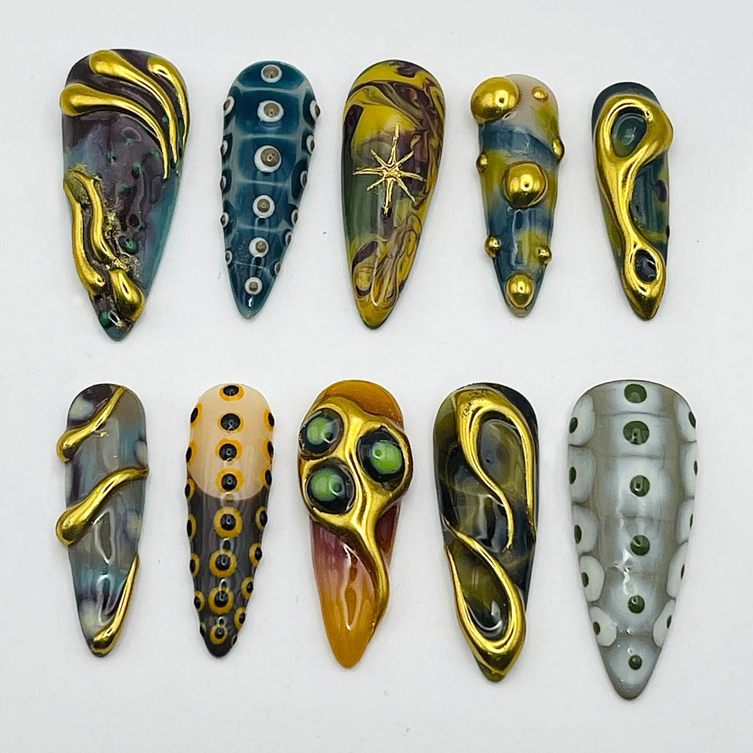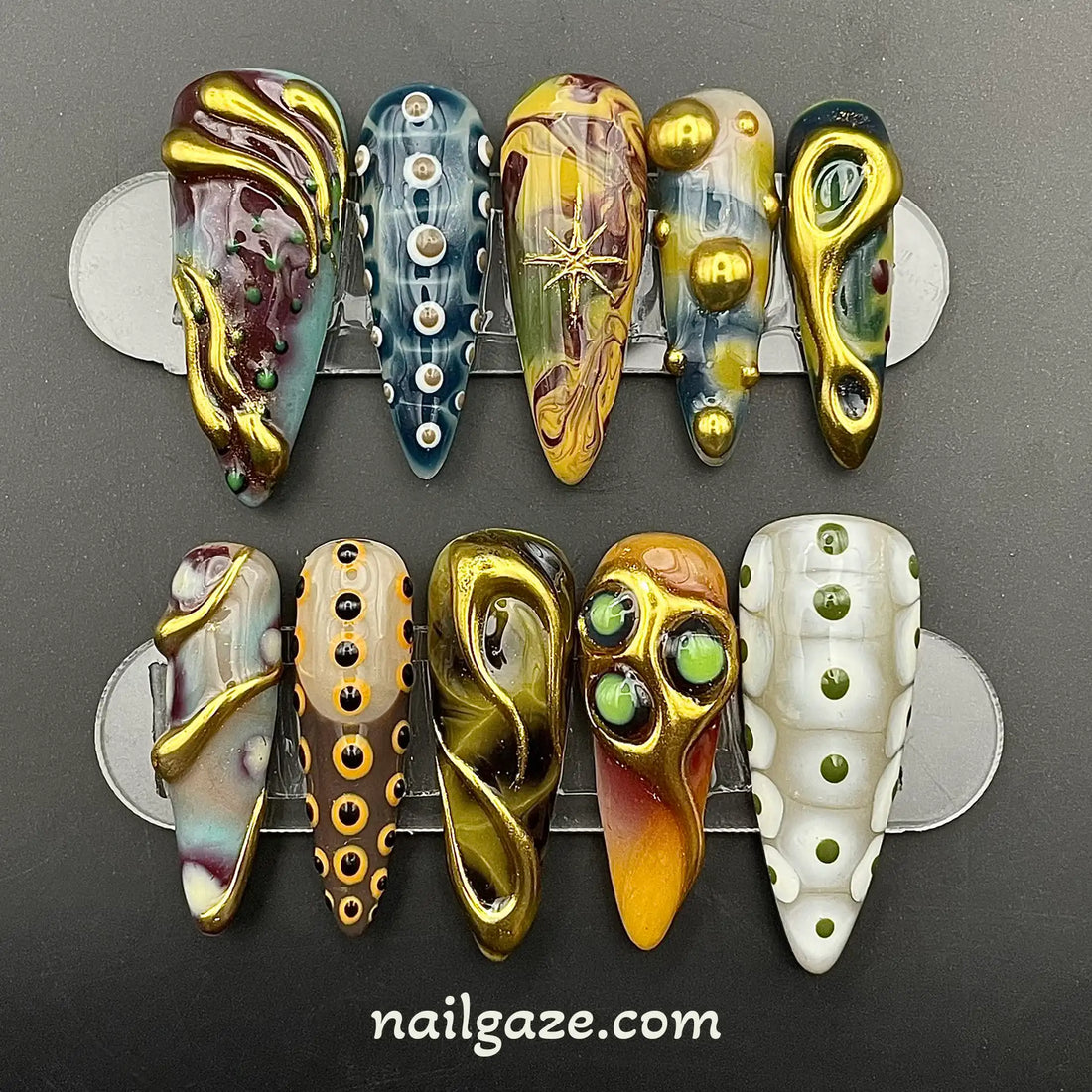 Handmade Abstract Gold 3D Sculptural Unique Artistic Press on Nails A49