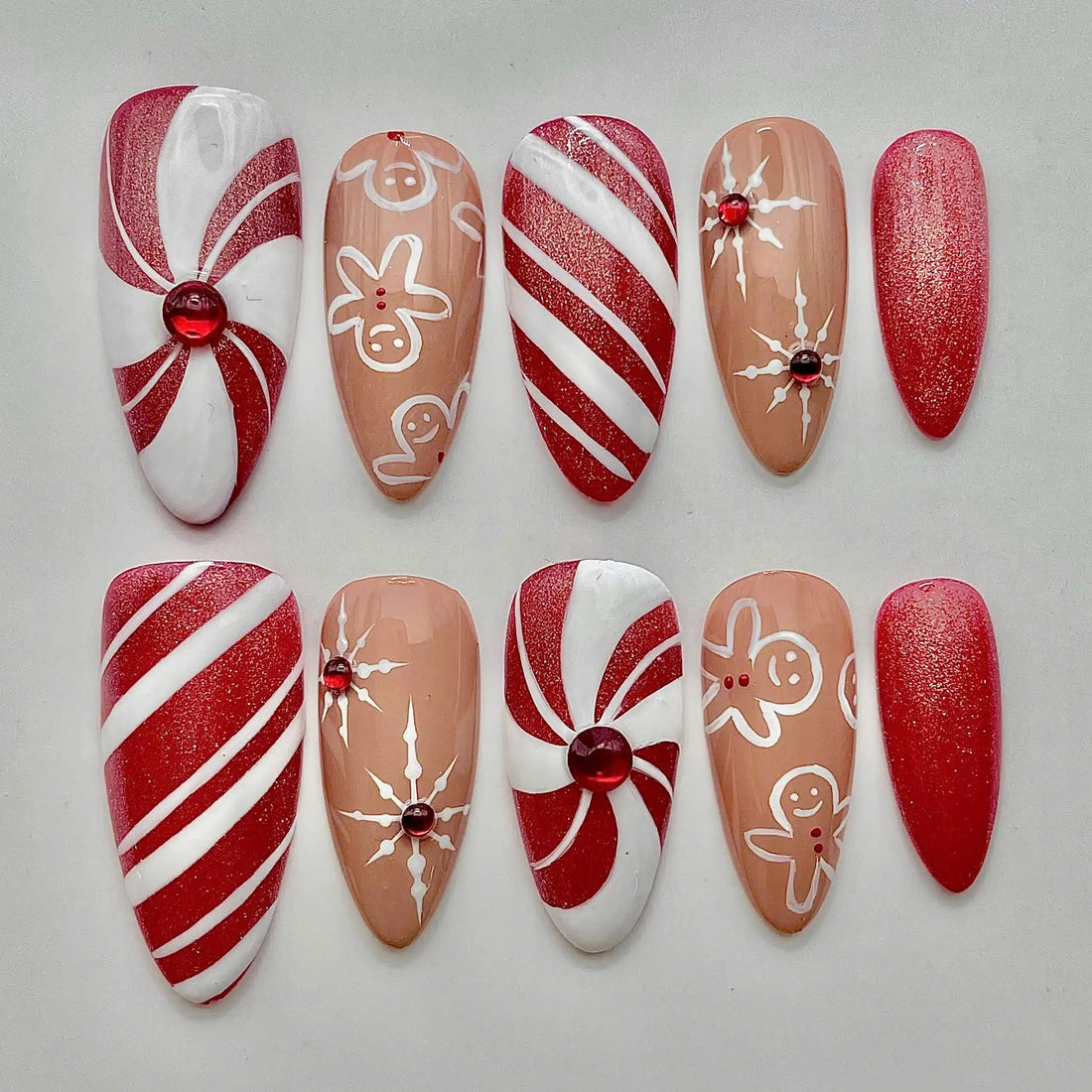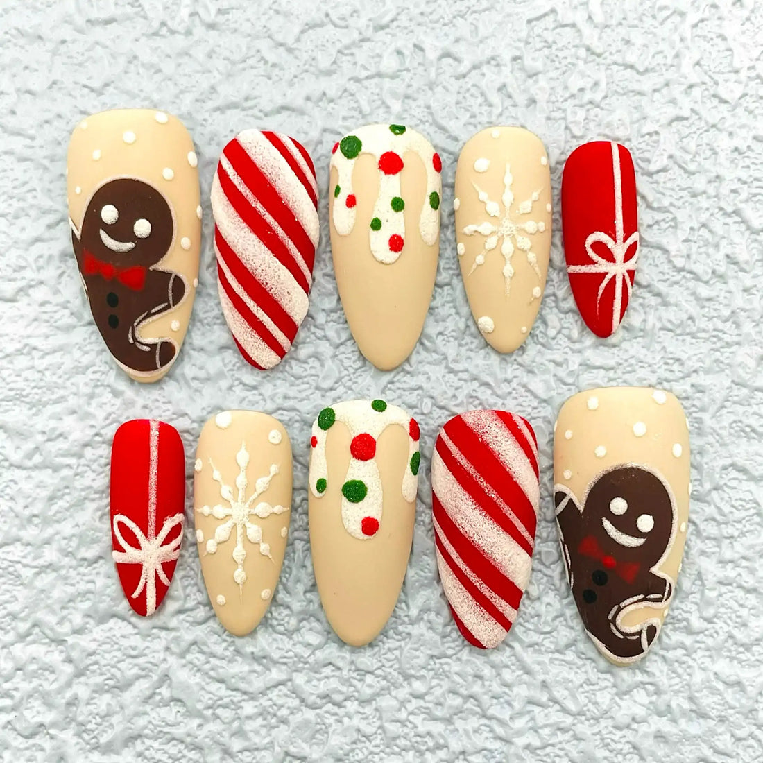 Celebrate the season with these delightful handmade press-on nails! Featuring charming gingerbread men, classic candy...