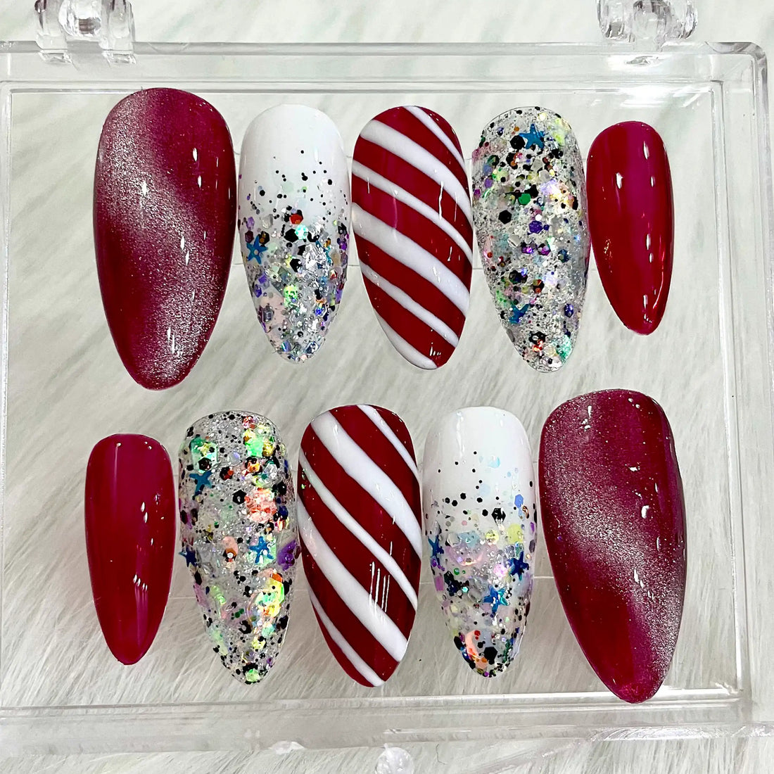 Handmade Christmas Candy Cane Glitter Red White Press on Nails Q69