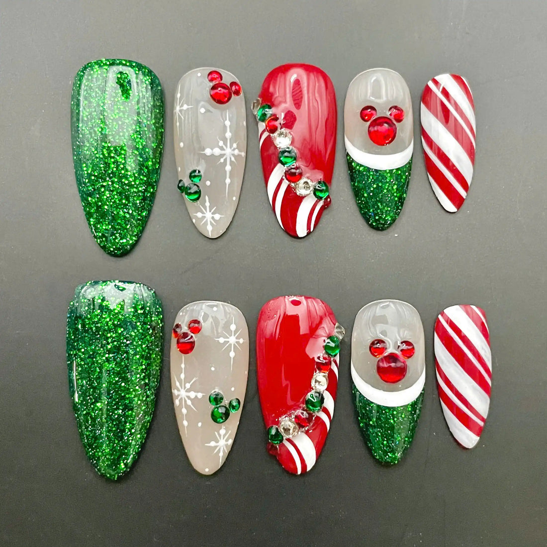 Celebrate the season with these festive handmade press-on nails! Featuring sparkling green glitter, classic candy...
