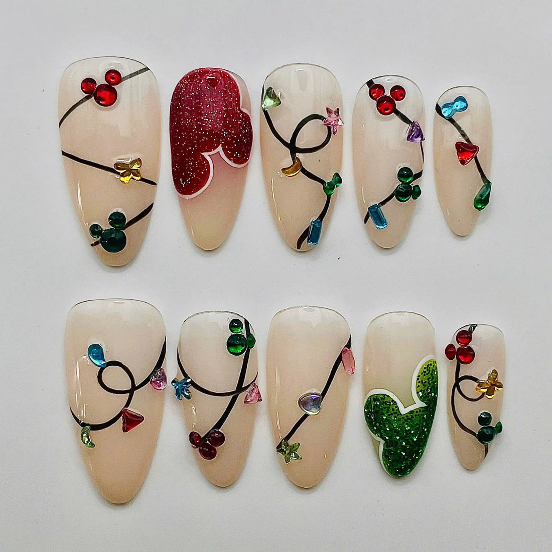 Handmade Christmas Lights Colorful Glitter Festive Press on Nails C10