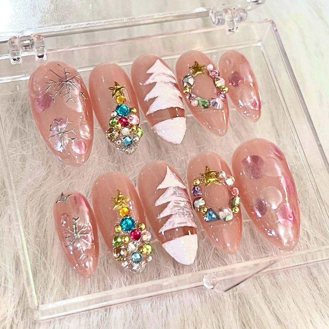 Celebrate the season with these enchanting handmade press-on nails! Featuring sparkling Christmas trees, festive wreaths...