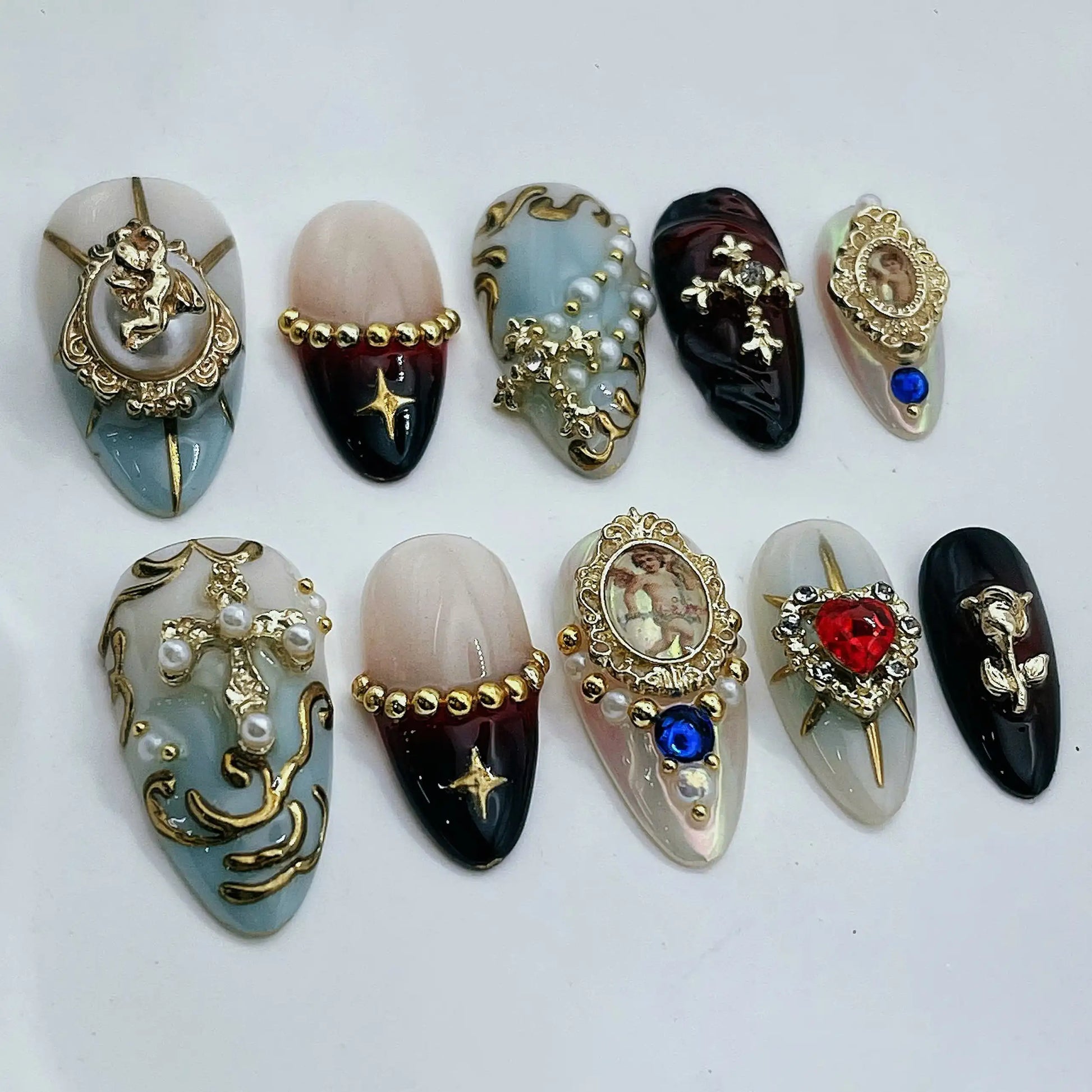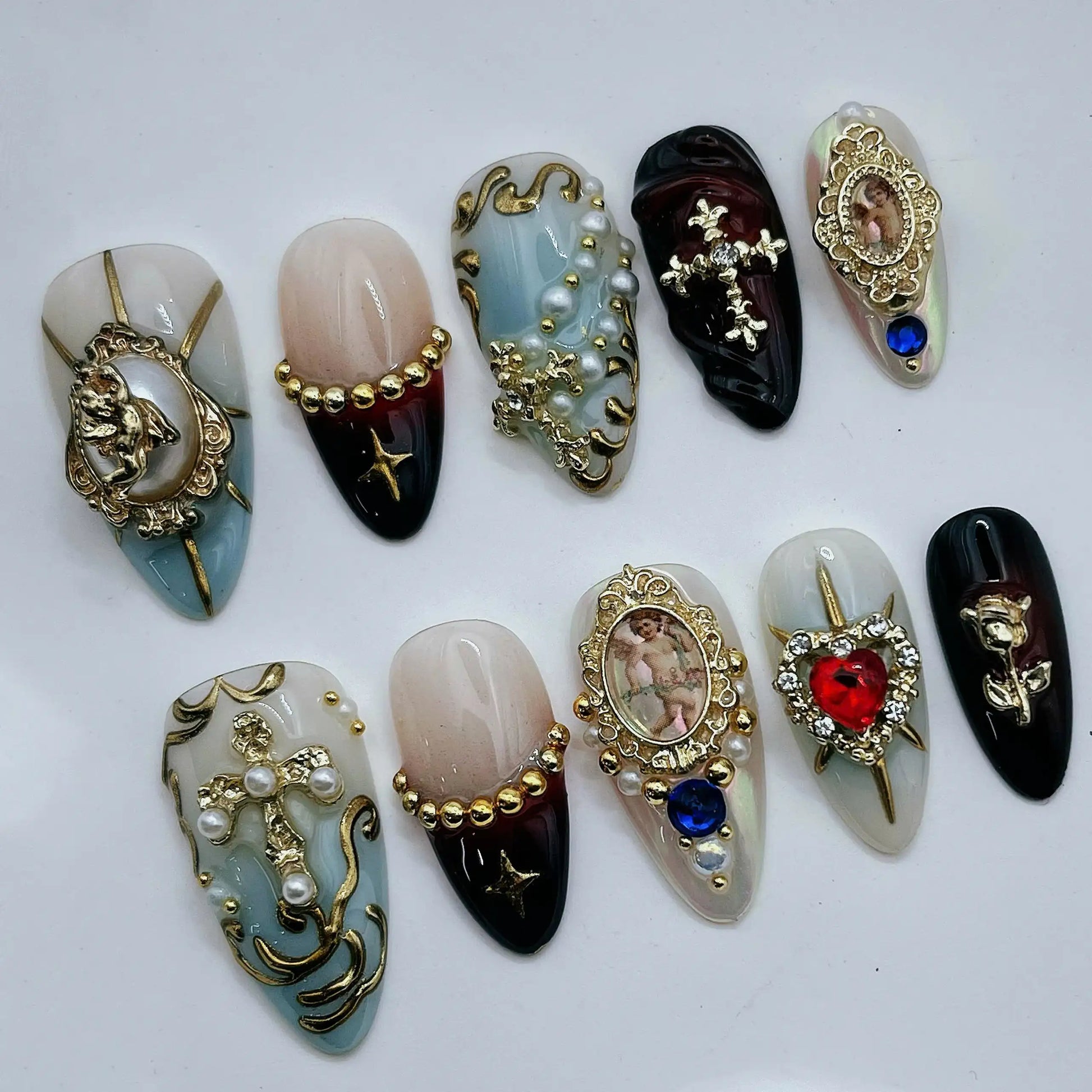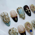 Make a divine statement with these luxury gothic fake fingernails, elegantly featuring stunning holy angels and ornate gold cross frames. These exquisite reusable nails deliver a flawless salon quality manicure you can effortlessly apply at home. Dramatically elevate your everyday style with this striking, unique, and powerful artistic set.