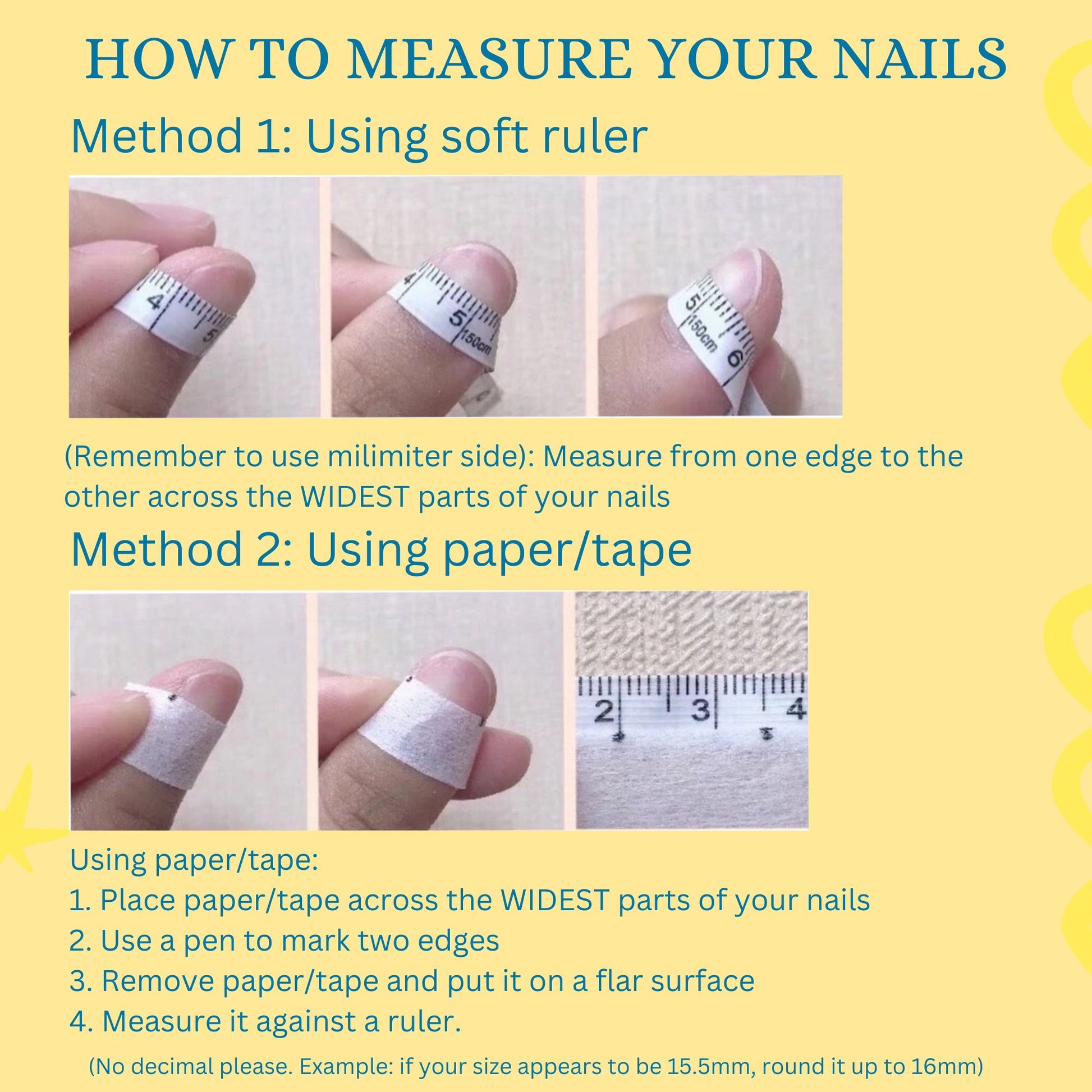 Finding the right size for your nails is important to get the perfect nail set. To figure out your nail sizes, check out our easy tutorial with 3 simple methods.You can find it here.