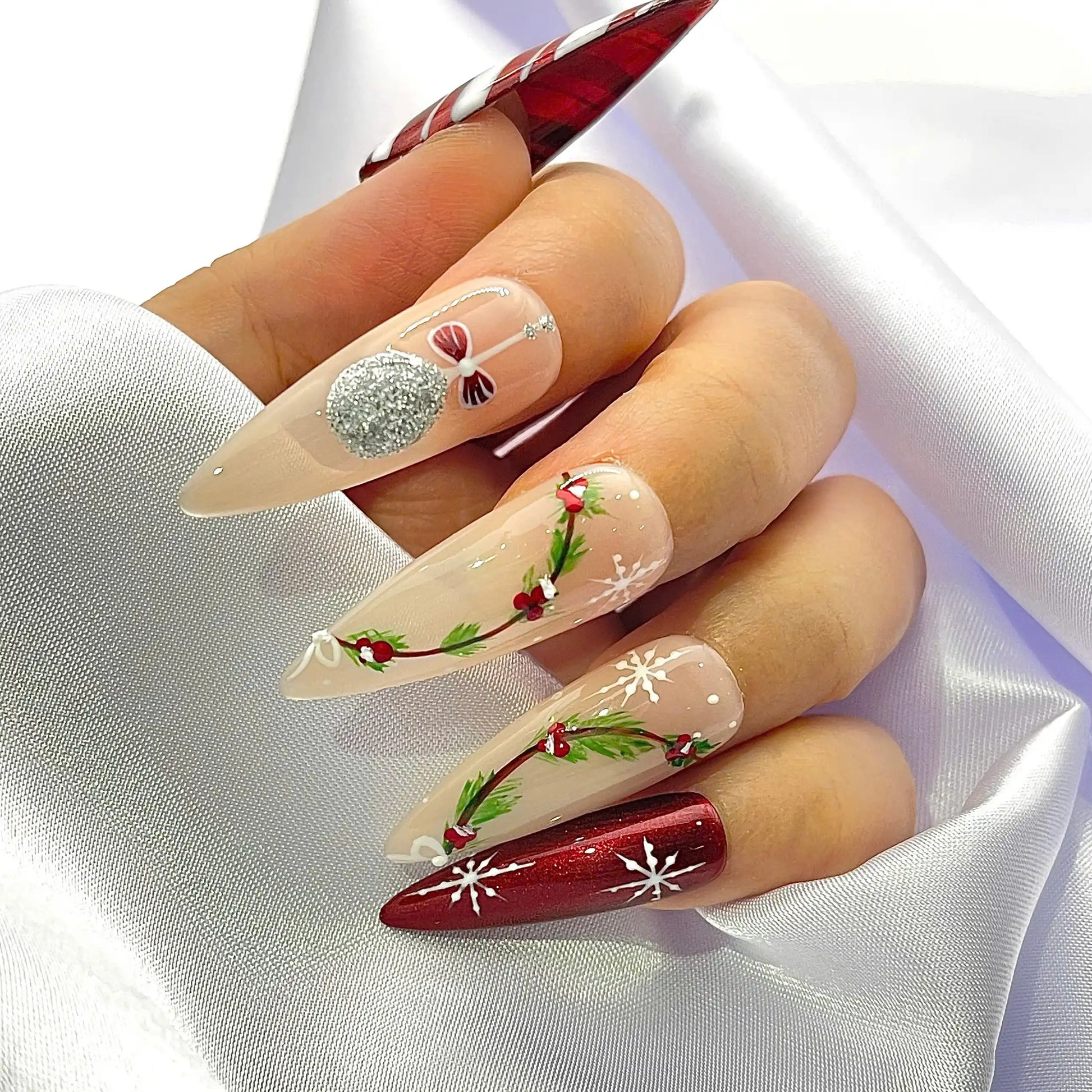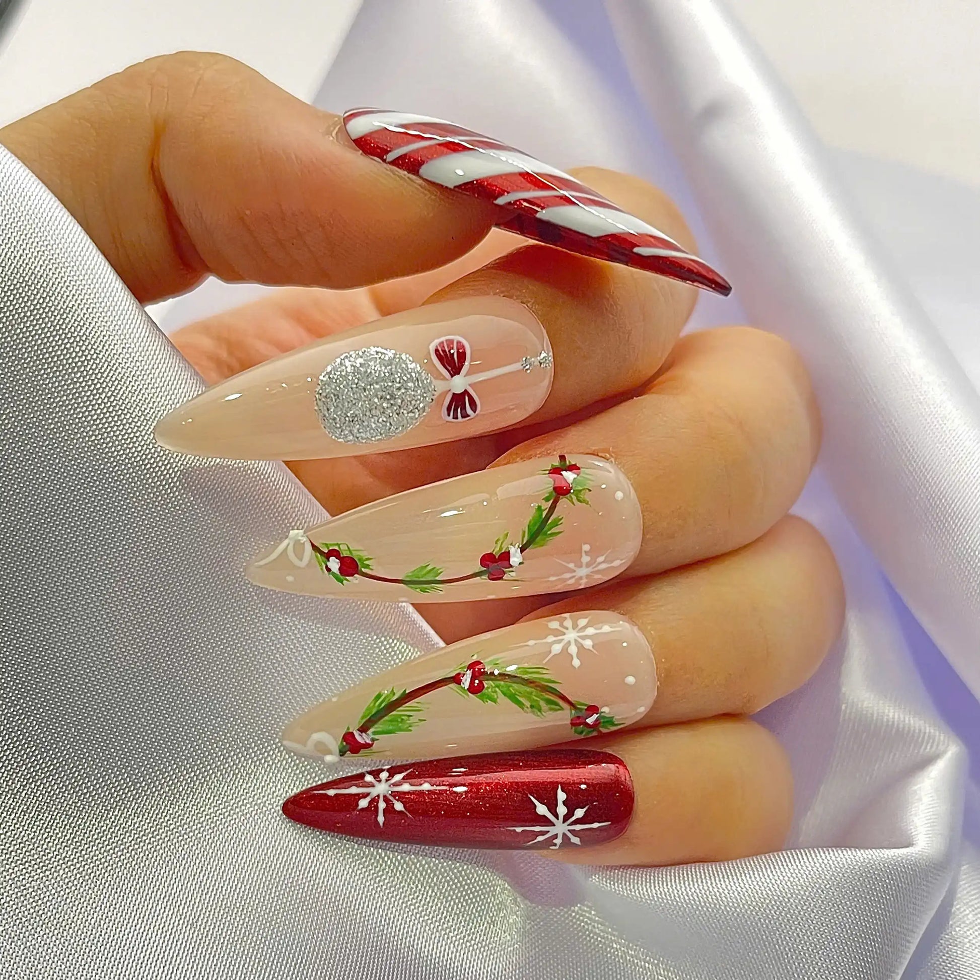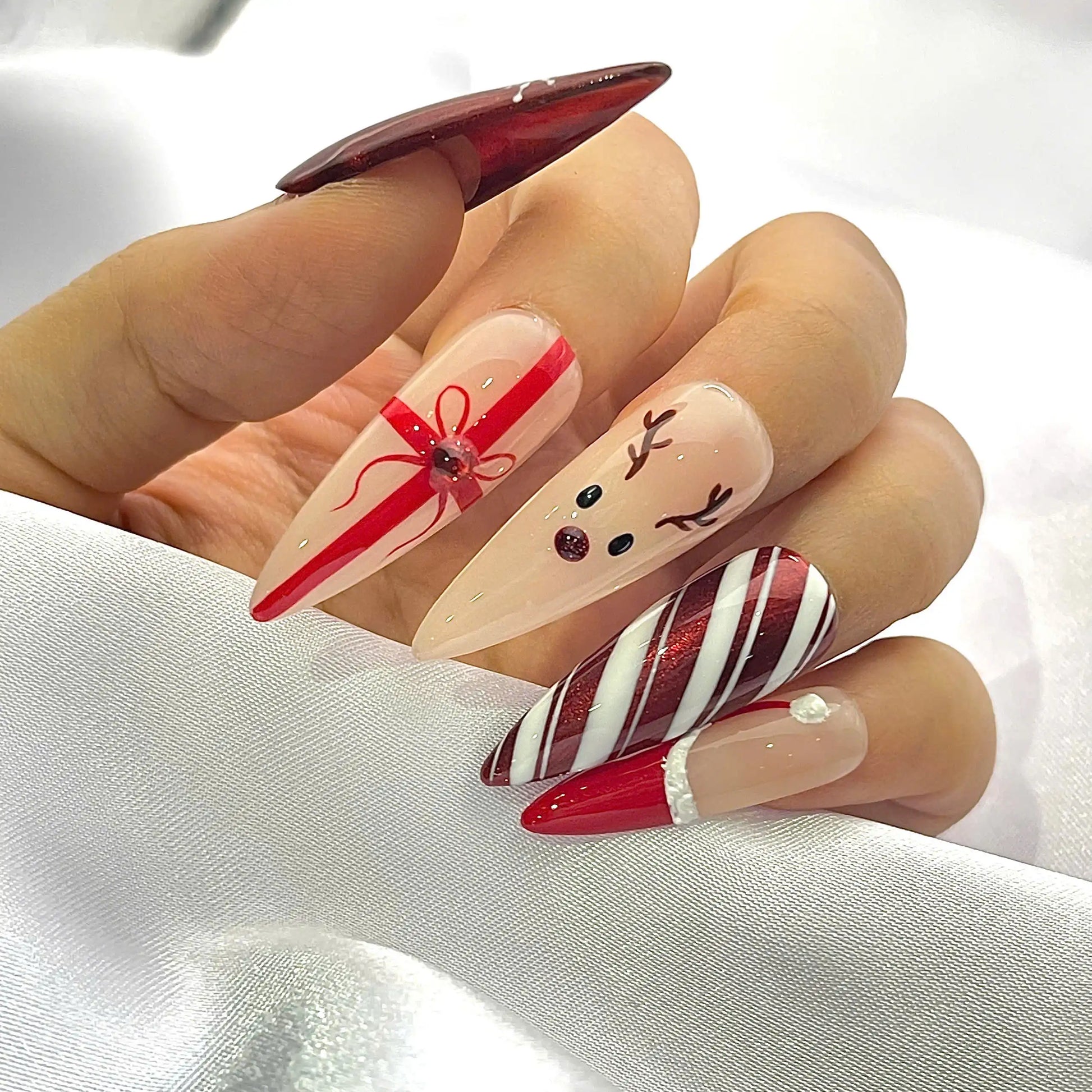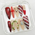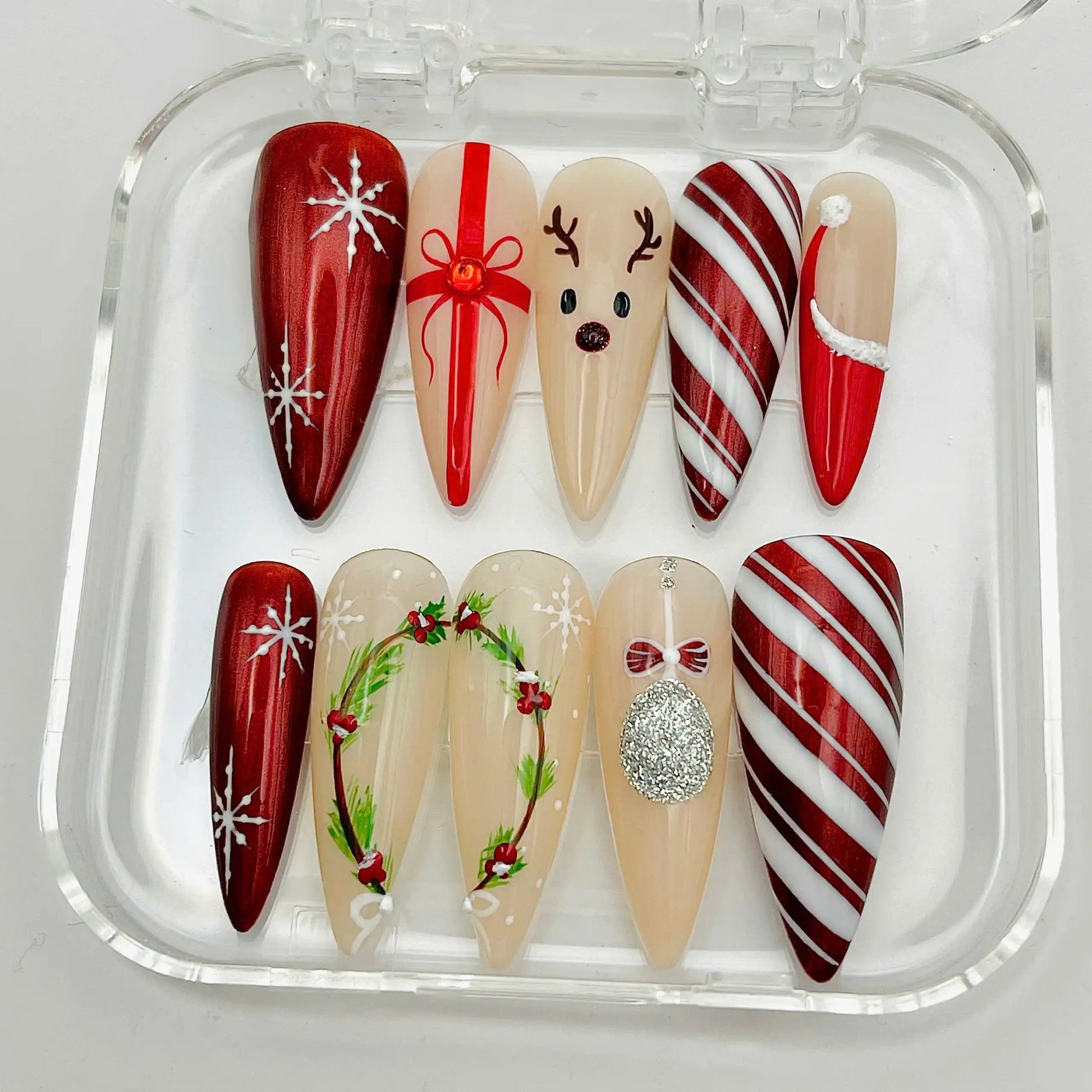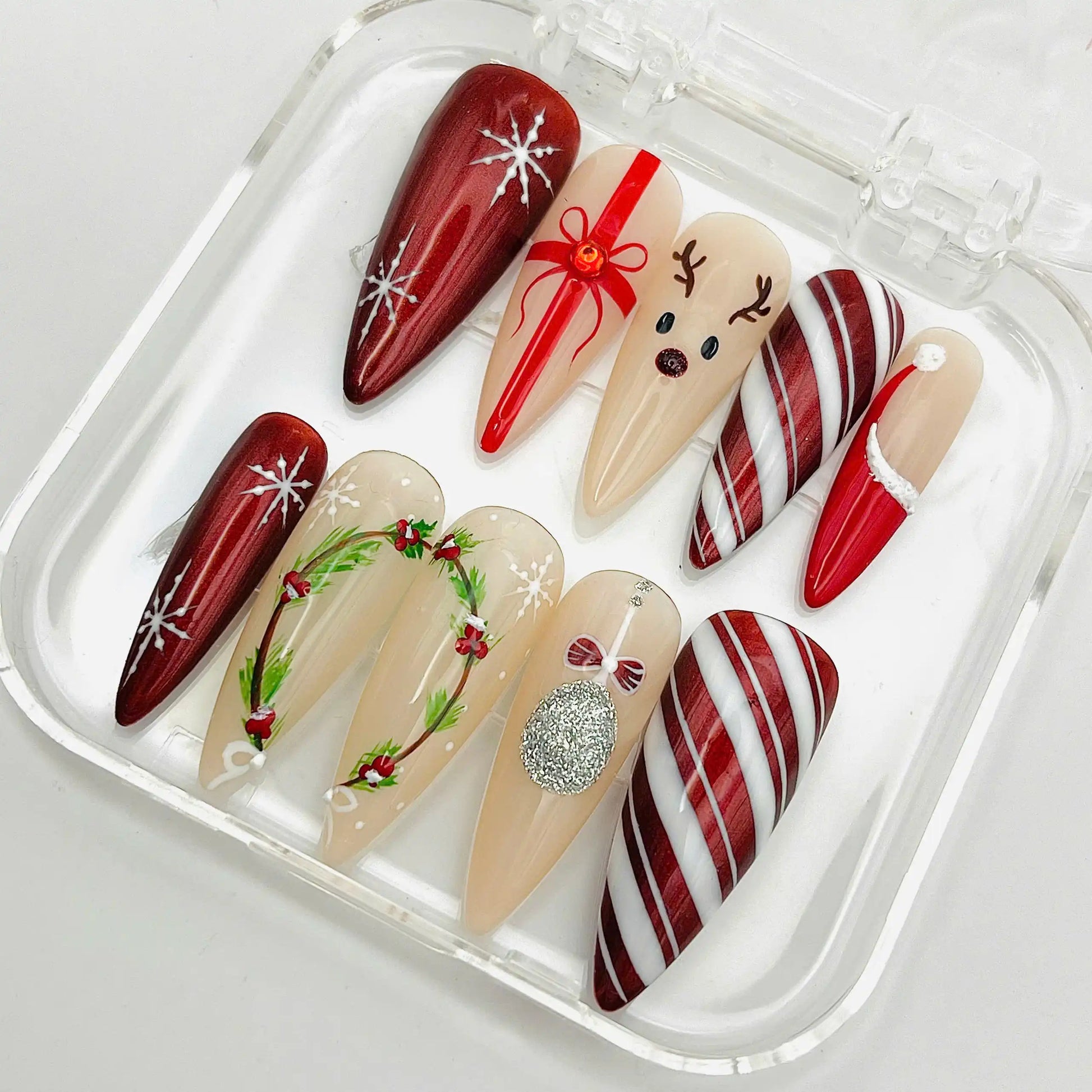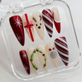 Handmade Christmas Candy Cane Reindeer Gift Wreath Festive Press on Nails S25
