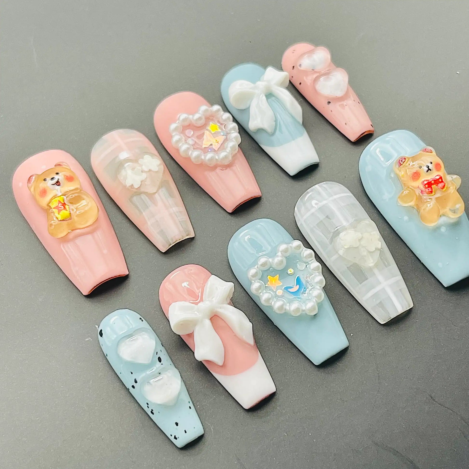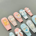 Embrace adorable style with these charming handmade press-on nails! Featuring cute 3D teddy bears, delicate bows, sweet hearts, and elegant pearl accents on soft pastel pink and blue, they create a truly kawaii look. Reusable and customizable, these fingernails are perfect for parties, everyday fun, or adding a unique, whimsical touch with a glossy finish. Available in various shapes and lengths. Get your delightful and charming set today!
