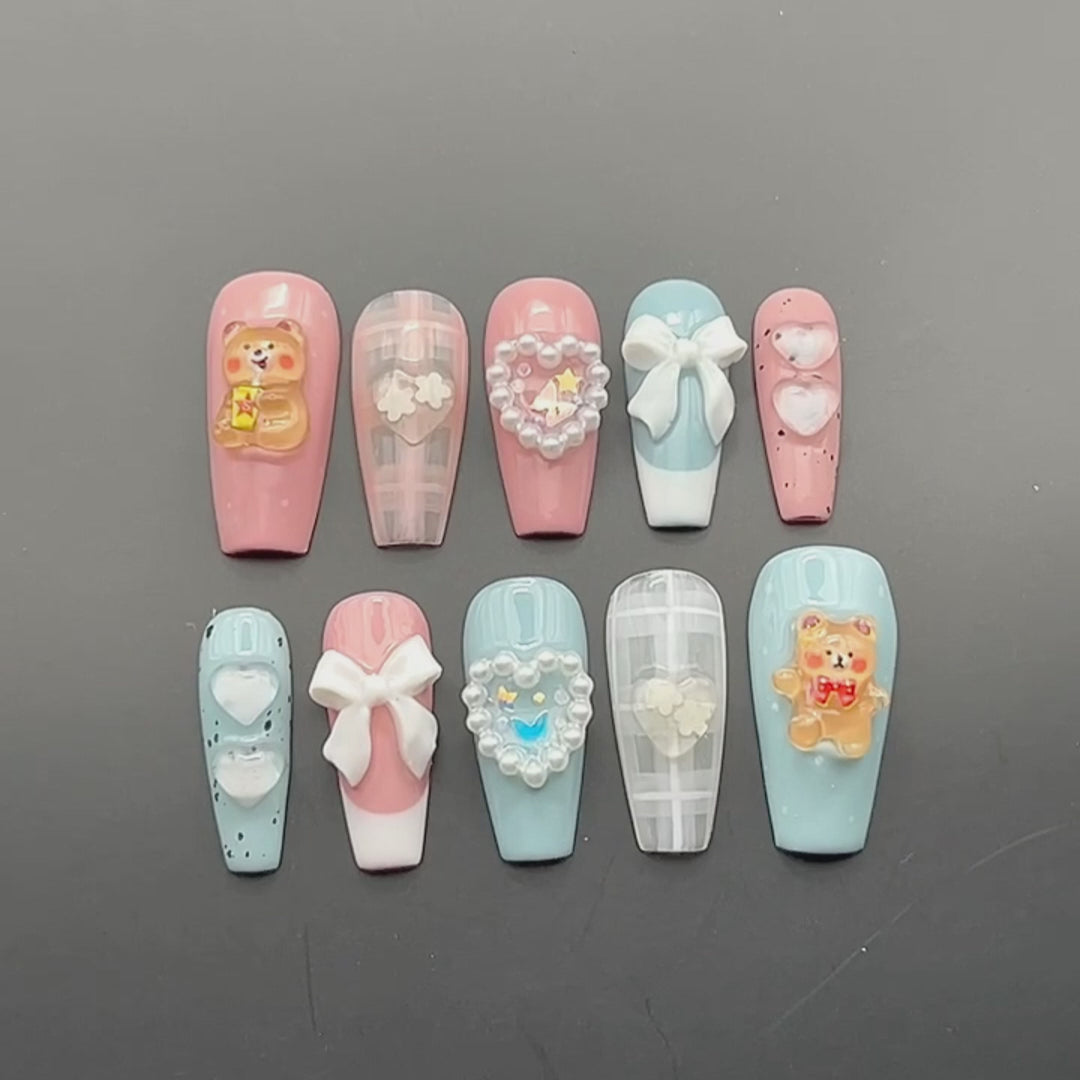 Handmade Kawaii Teddy Bear Bow Heart Pastel Press on Nails H70