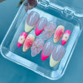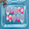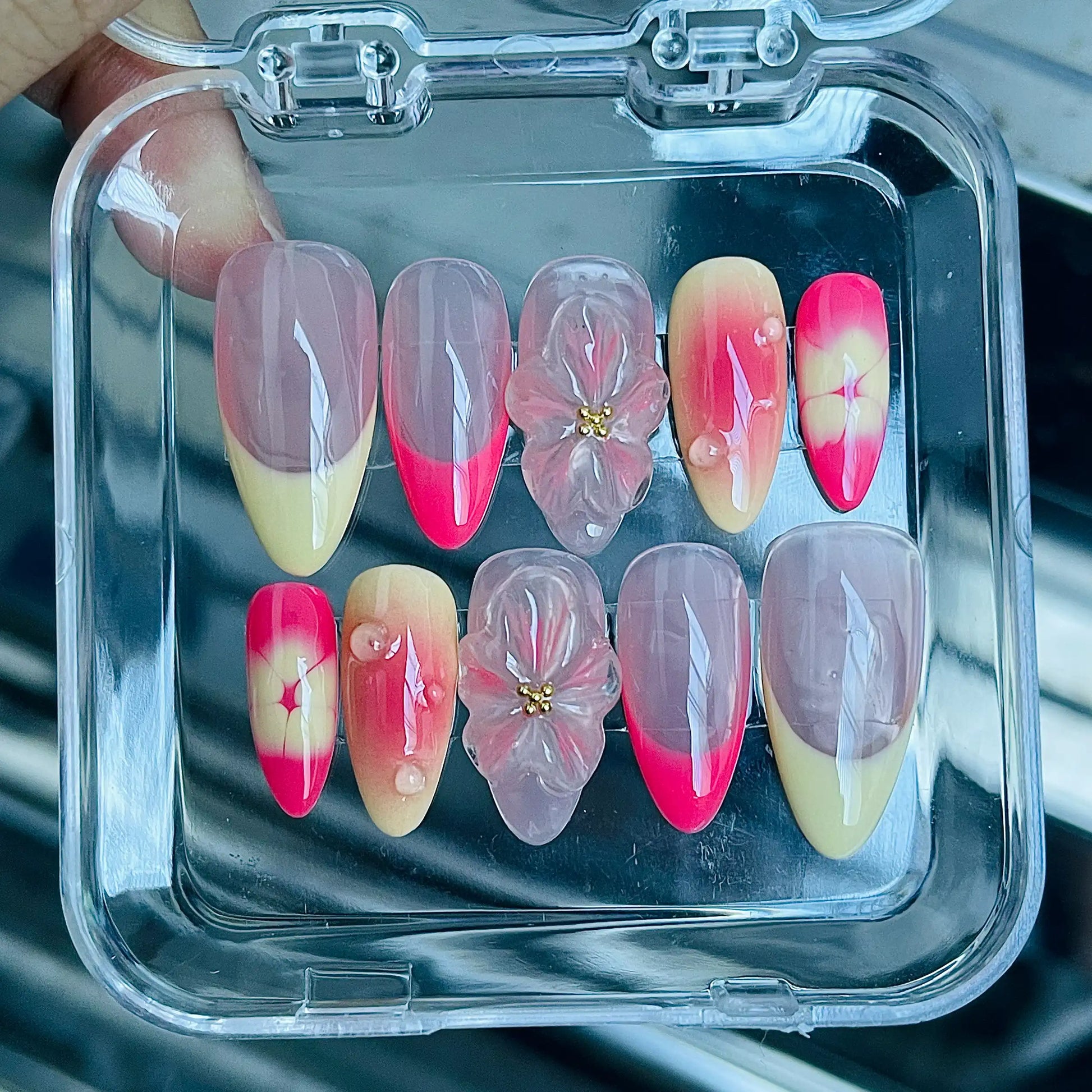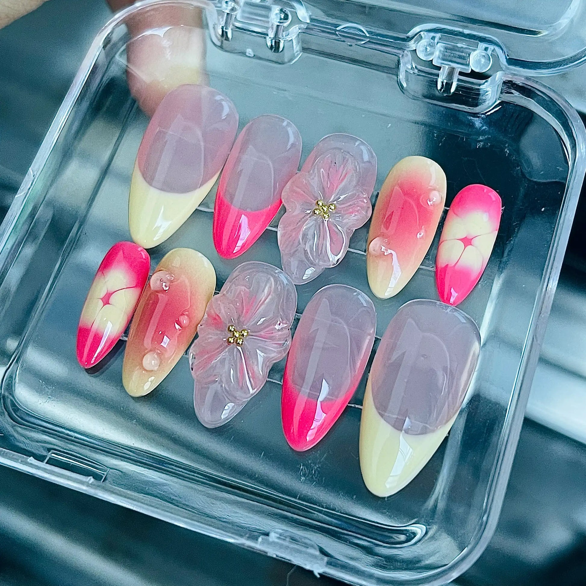 Refresh your look with these exquisite handmade press-on nails! Featuring delicate 3D translucent flowers, realistic water droplets, and vibrant hot pink French tips on a sheer base, they capture a fresh, artistic spring aesthetic. Reusable and customizable, these fingernails are perfect for spring events, summer parties, or adding a unique, modern touch to daily wear with a glossy finish. Available in various shapes and lengths. Embrace fresh style – get your captivating set today!