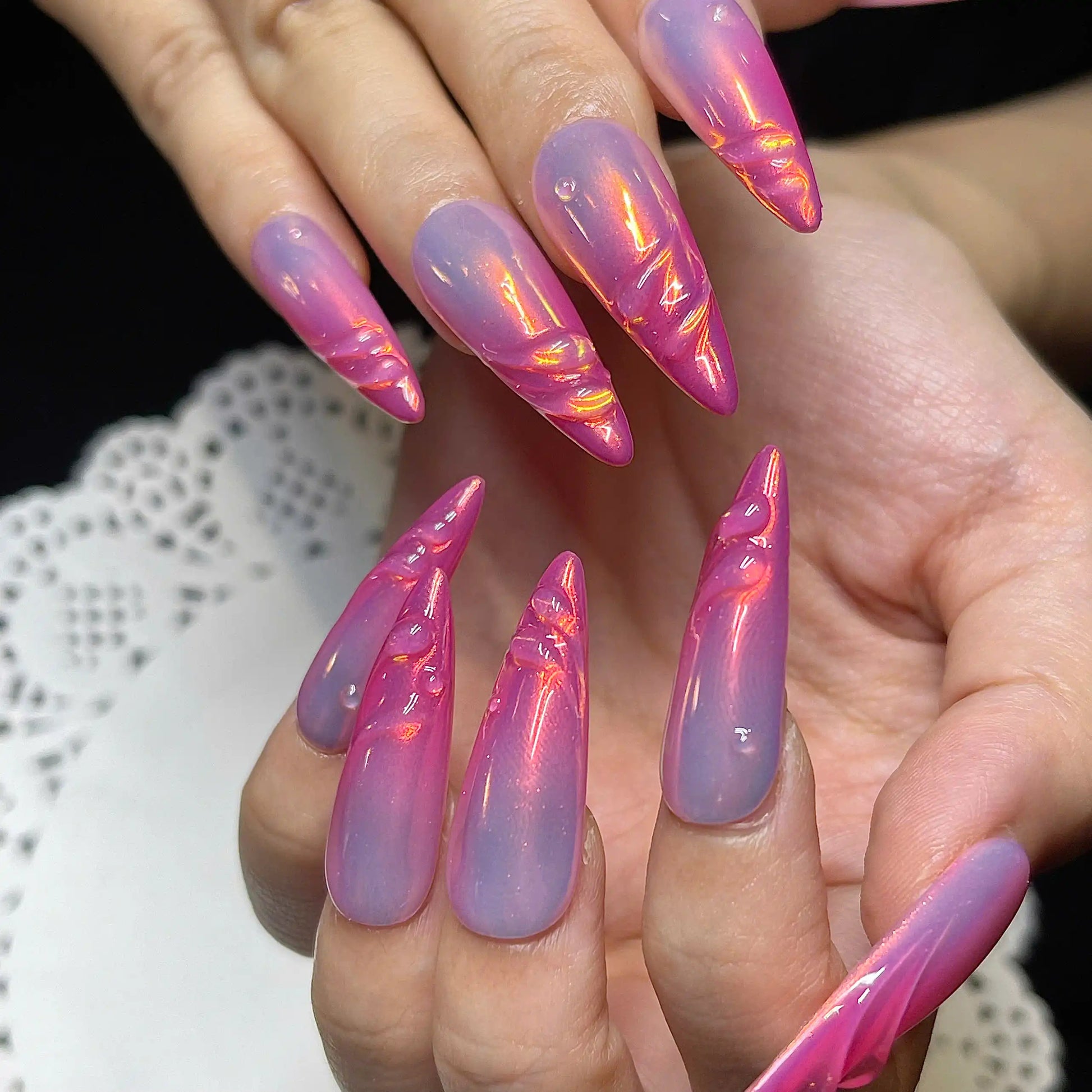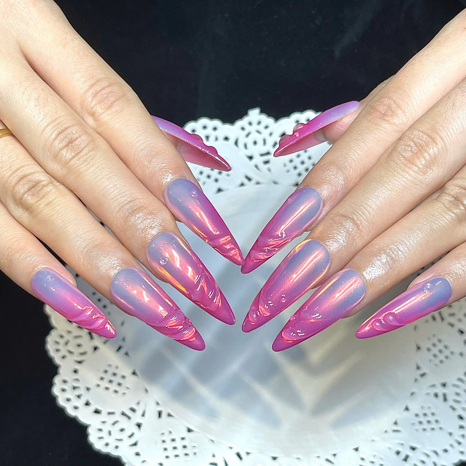 Command attention with these captivating handmade press-on nails! Featuring mesmerizing pink and purple ombre hues with a dazzling chrome iridescent finish and sculpted 3D waves. Reusable and customizable, these unique fingernails are perfect for parties, festivals, or adding futuristic, ethereal glamour to daily wear. Available in various shapes and lengths. Embrace your vibrant style – get your set now!