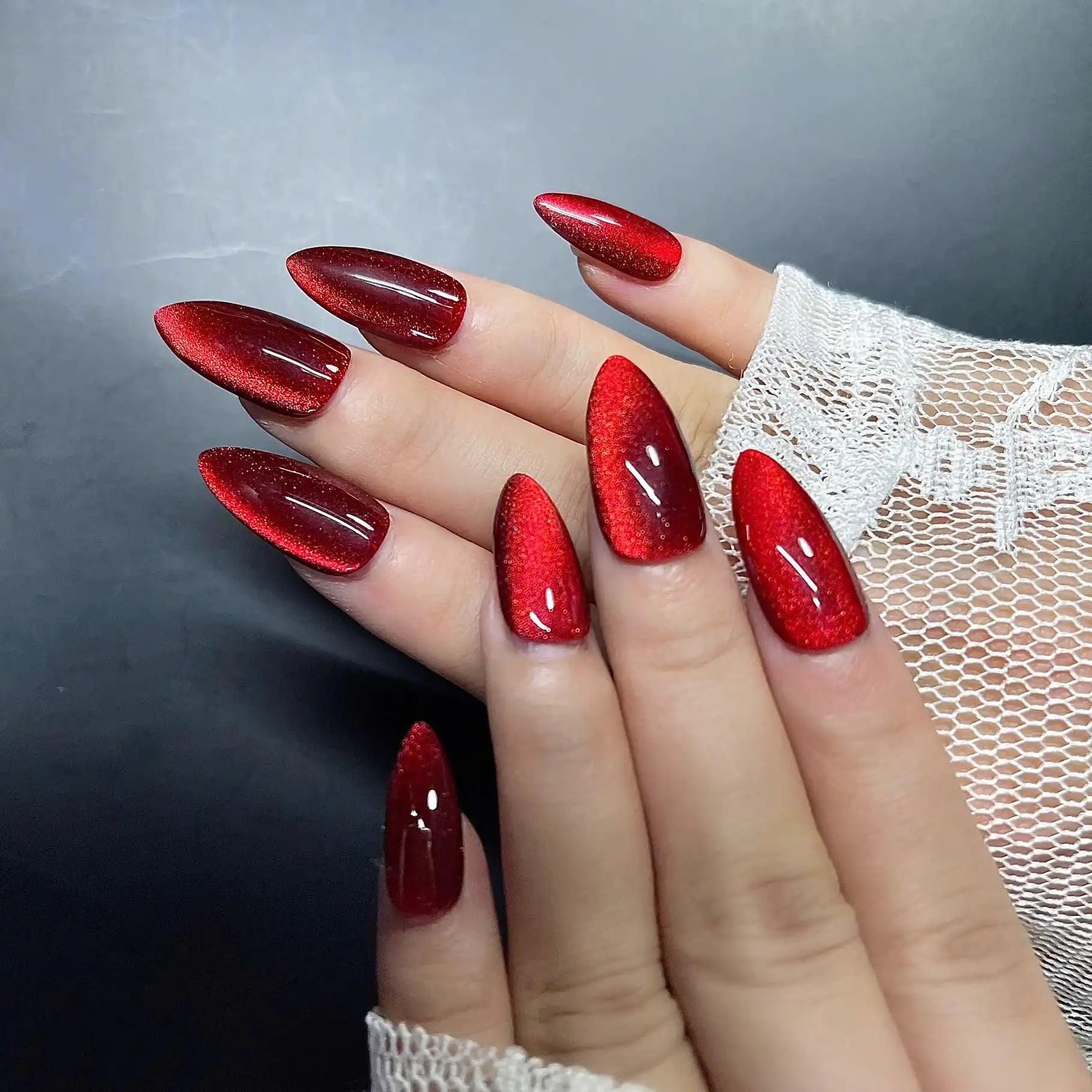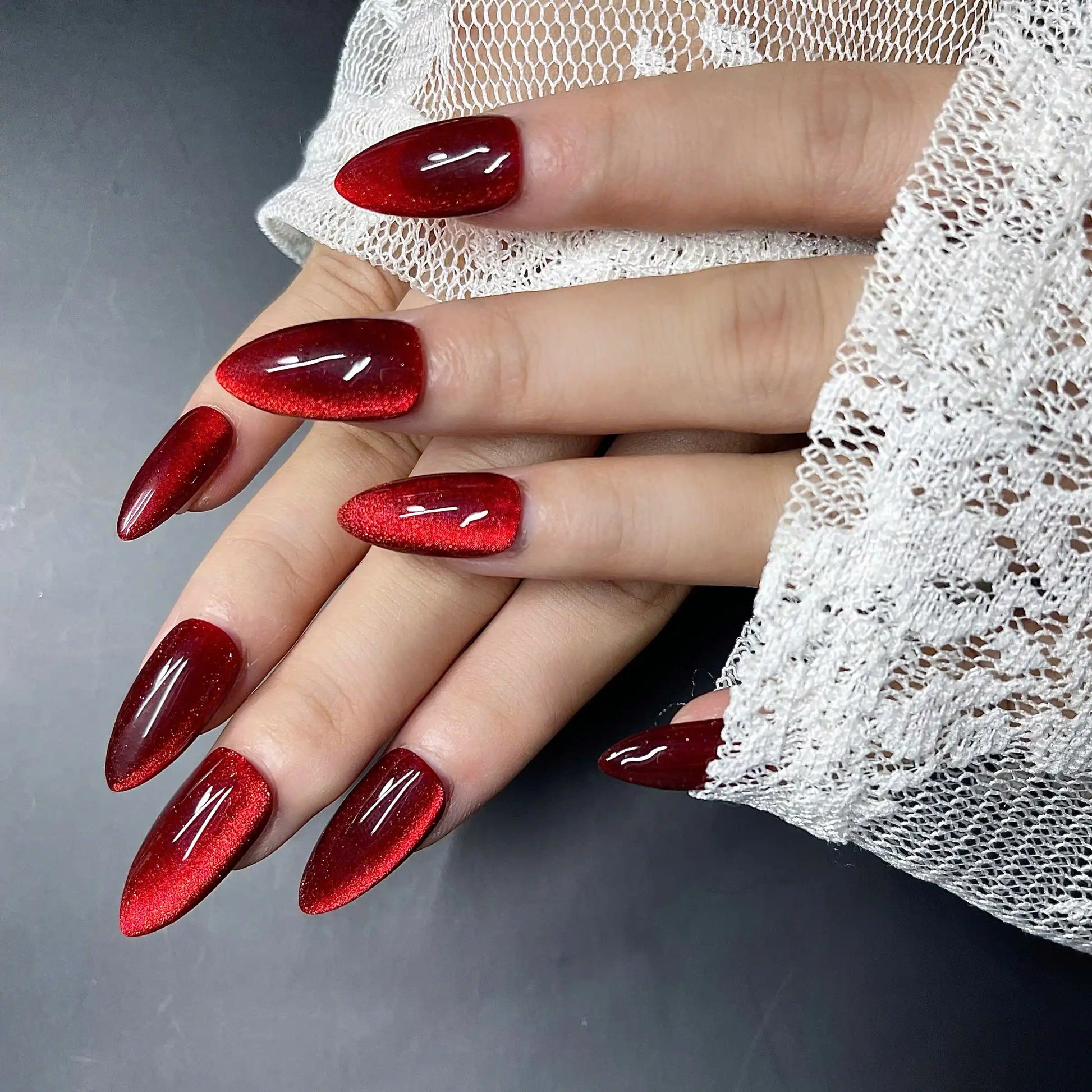 Command attention with these captivating handmade press-on nails! Featuring a mesmerizing red cat eye effect with a magnetic shimmer, they exude luxurious elegance. Reusable and customizable, these bold fingernails are perfect for parties, nights out, or adding a sophisticated, unique touch to daily wear with a glossy finish. Available in various shapes and lengths. Embrace your magnetic allure – get your set now!