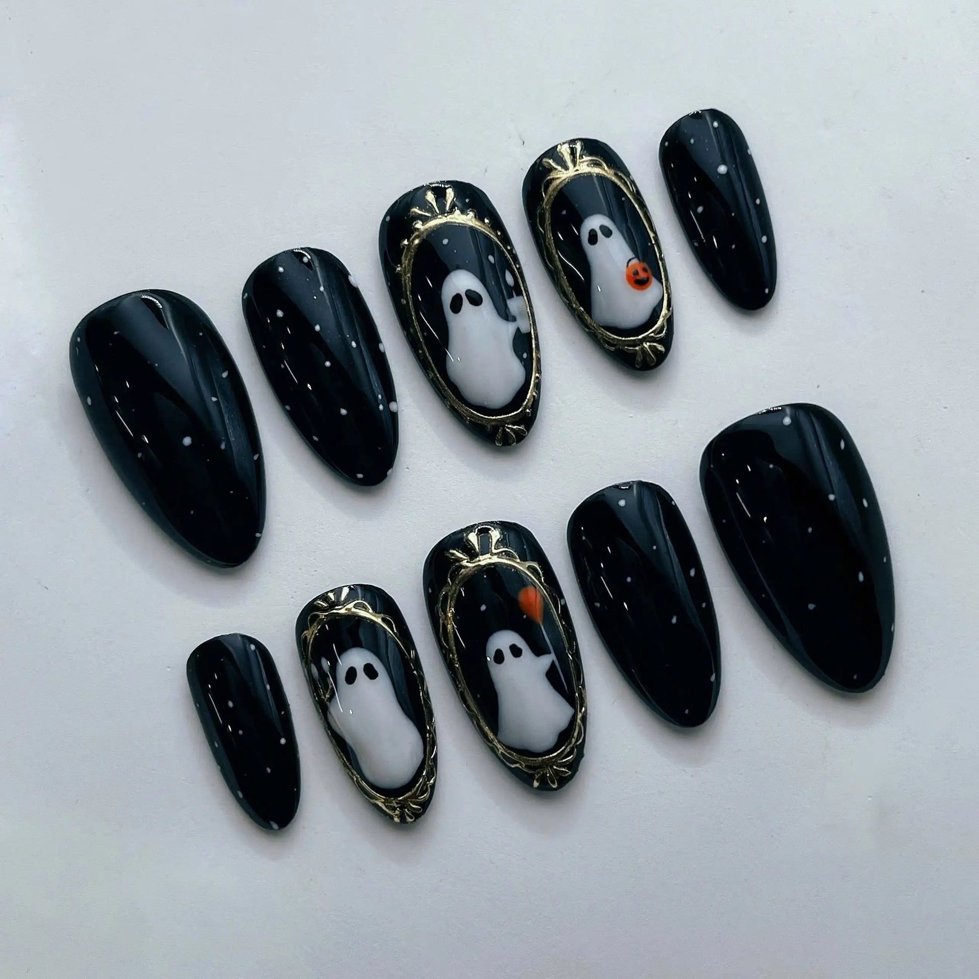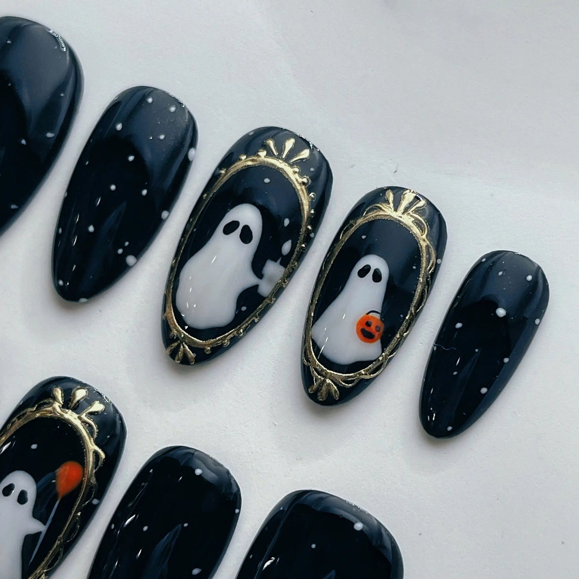 Celebrate the spooky season with these festive black fake fingernails, delightfully showcasing cute ghosts inside elegant gold portrait frames. These fun reusable nails provide a gorgeous salon quality Halloween manicure that effortlessly applies at home. Instantly elevate your haunted holiday style with this incredibly unique festive set.